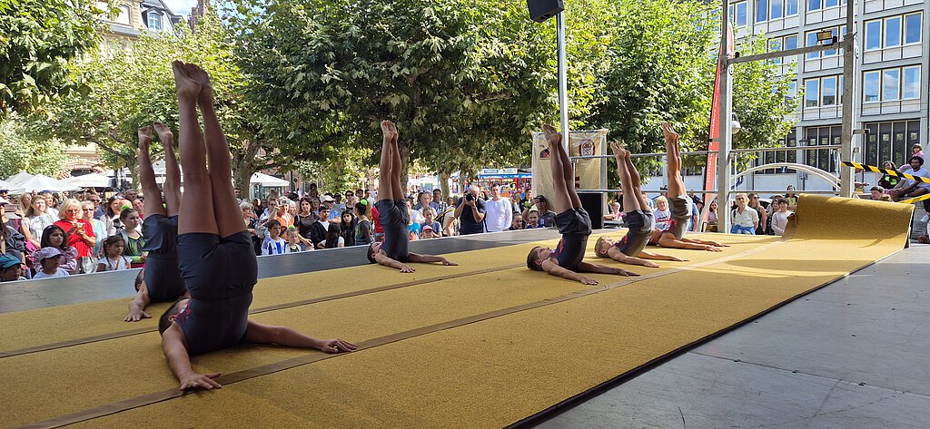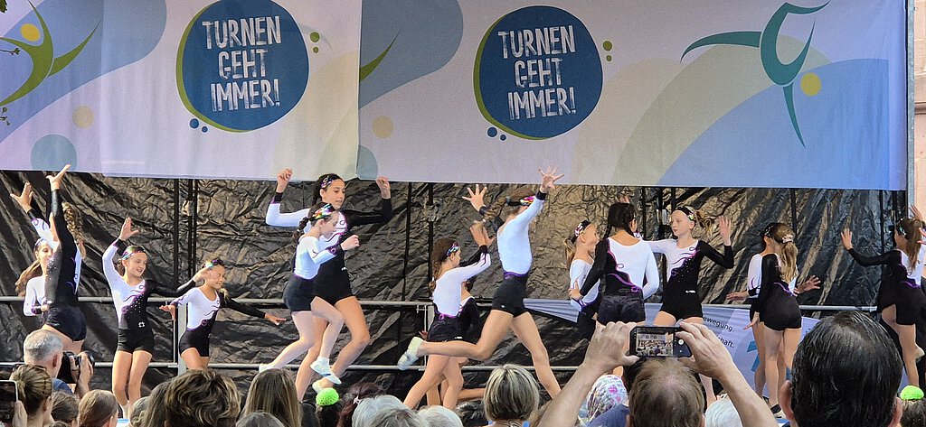 Aber nicht nur staunen und klatsche konnte man. Einzelne Gruppen luden das Publikum auch direkt zum Mitmachen ein, wie z. B. die Zumba-Gruppe der TG Bornheim. Durch das abwechslungsreiche Programm wurde es nie langweilig. Viele Passanten verweilten so einige Zeit vor der Bühne. Insgesamt 15 Gruppen sorgten für das bunte und vielfältige Programm.